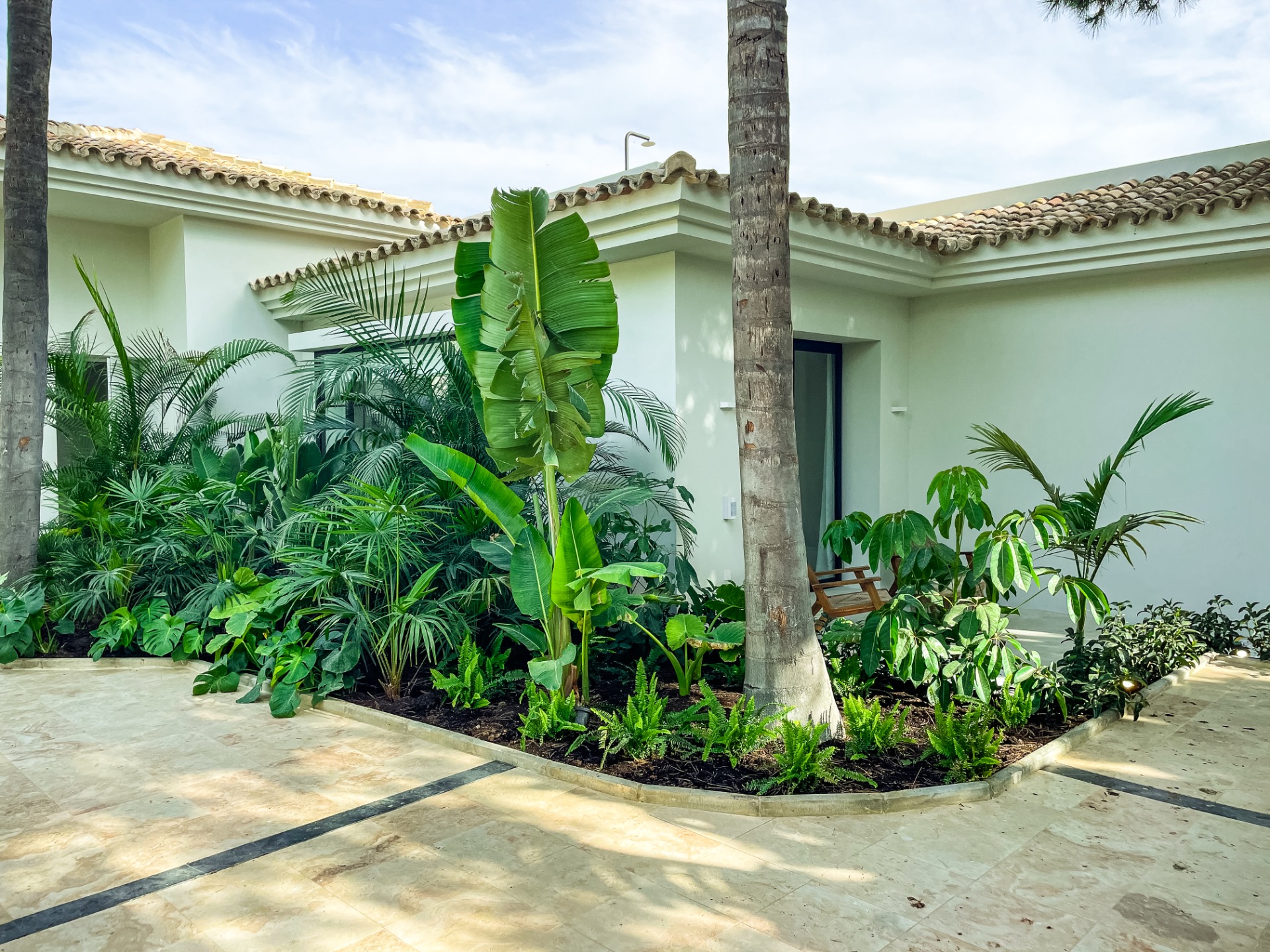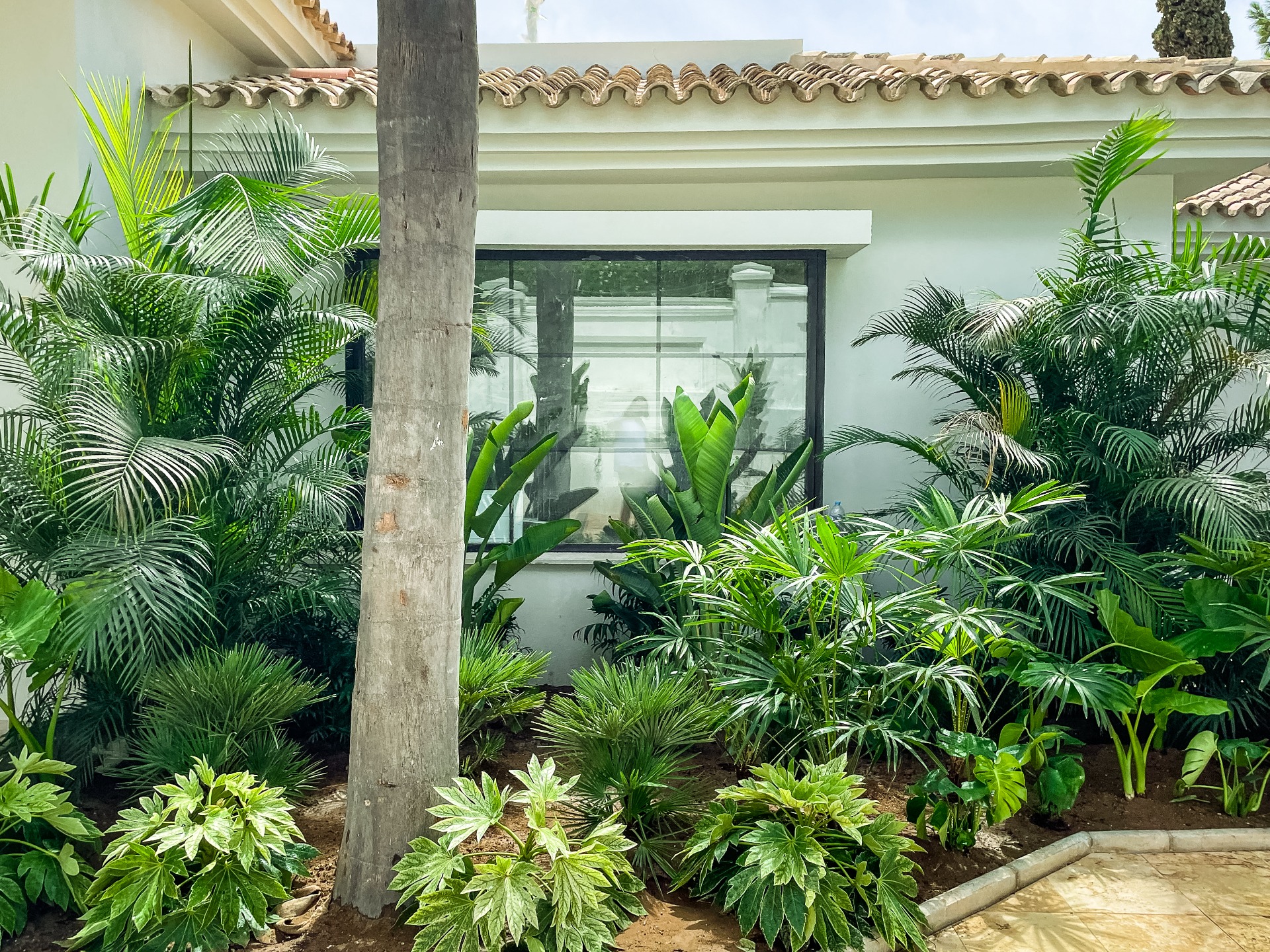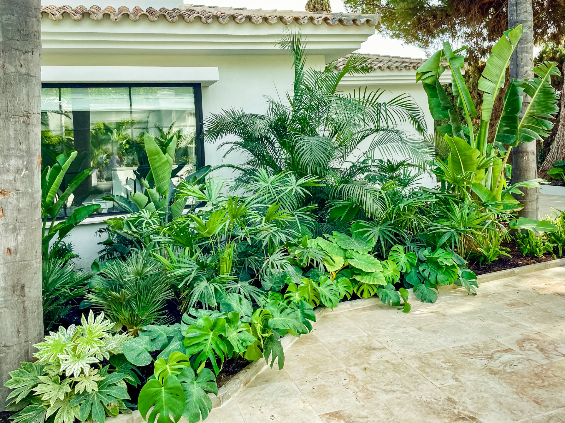 La propuesta vegetal apuesta por especies tropicales y subtropicales de gran presencia, como estrelicias, arecas lutescens, monstera deliciosa, aralias, chefleras, arecastrum, rhapis y palmitos, entre muchas otras variedades, creando un juego de volúmenes, texturas y verdes intensos que aportan profundidad y sensación de jardín consolidado desde el primer día.