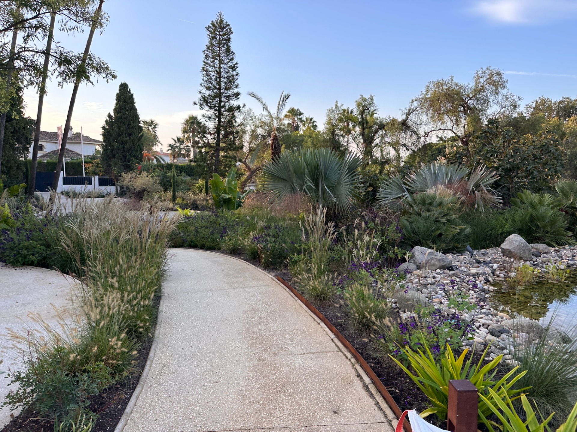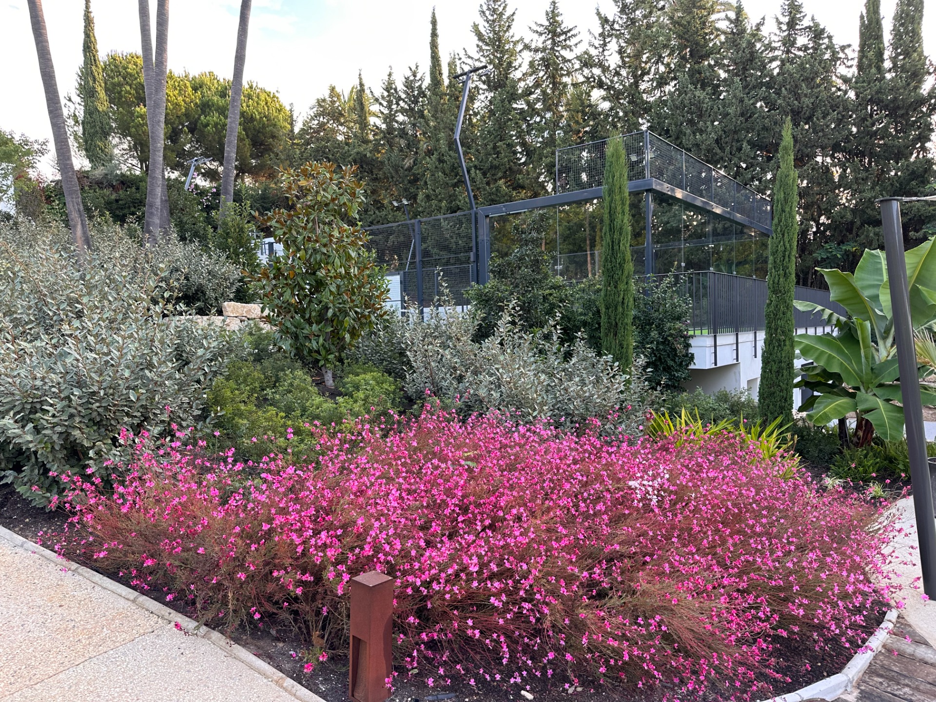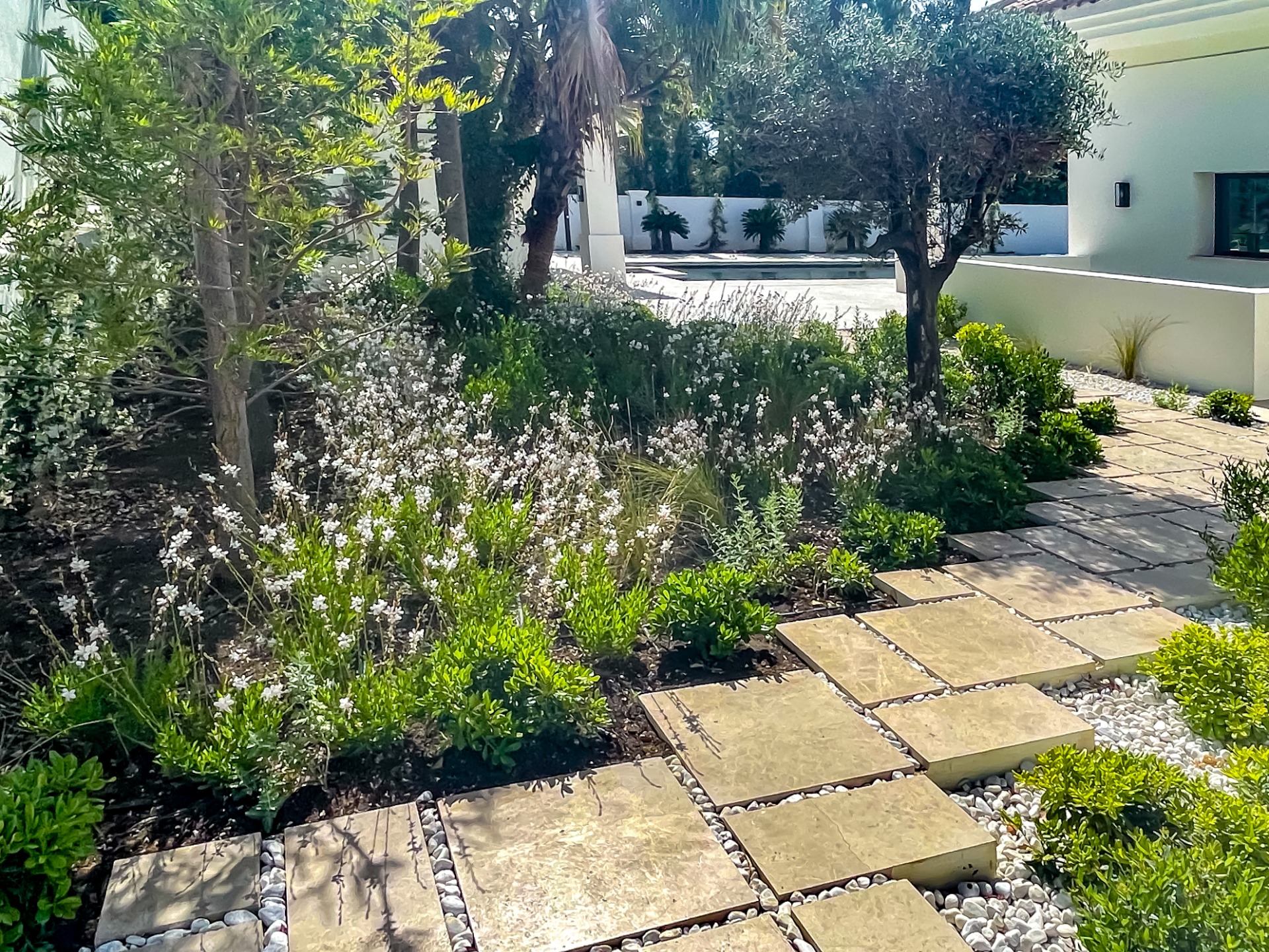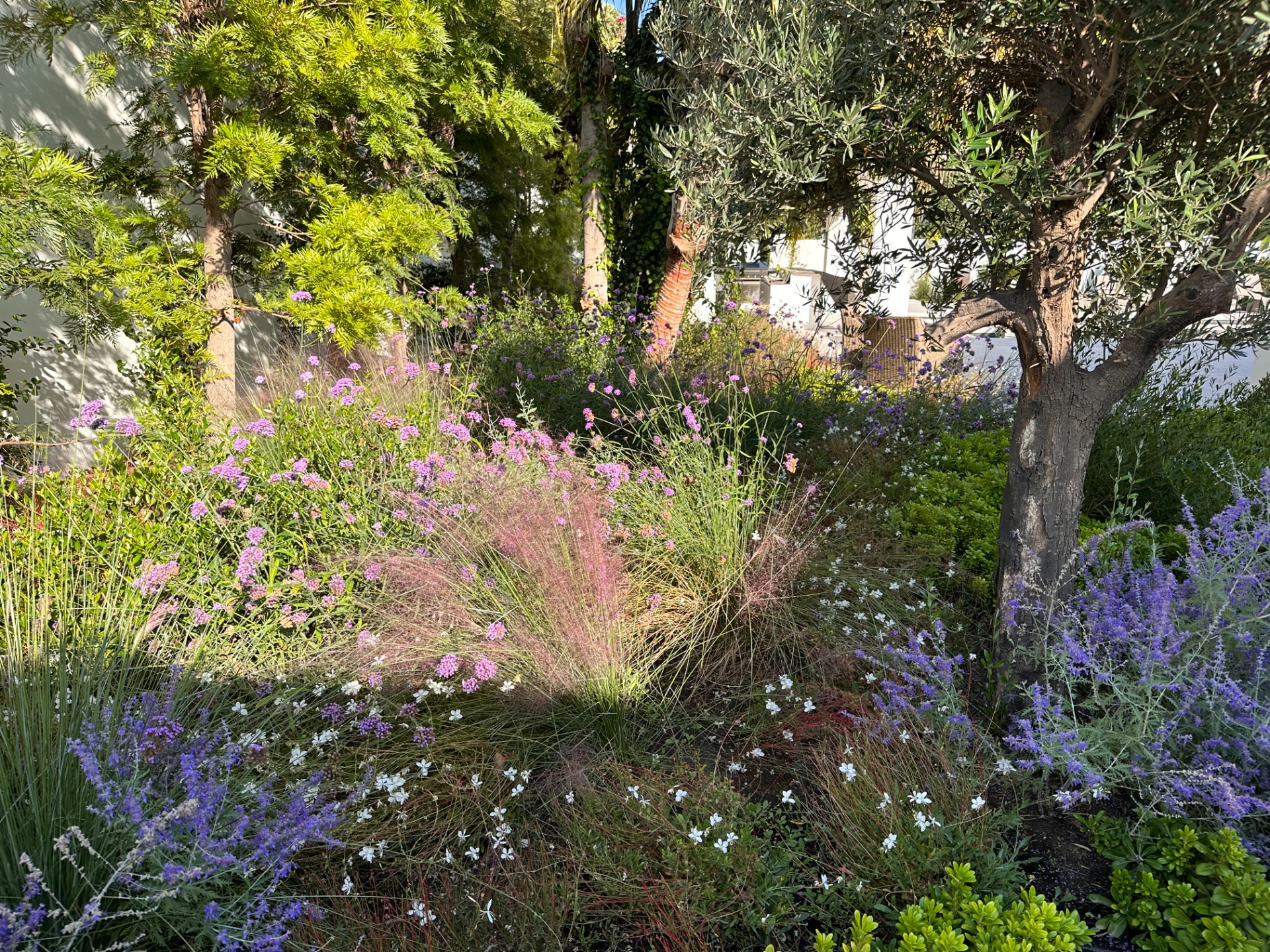 La vegetación combina olivos, cítricos, Albizia julibrissin, Jacaranda mimosifolia, Magnolia grandiflora, Washingtonia robusta, Eugenia myrtifolia, Araucaria, bambú, junto a herbáceas como Gaura y Salvia, aportando movimiento, color y riqueza visual.