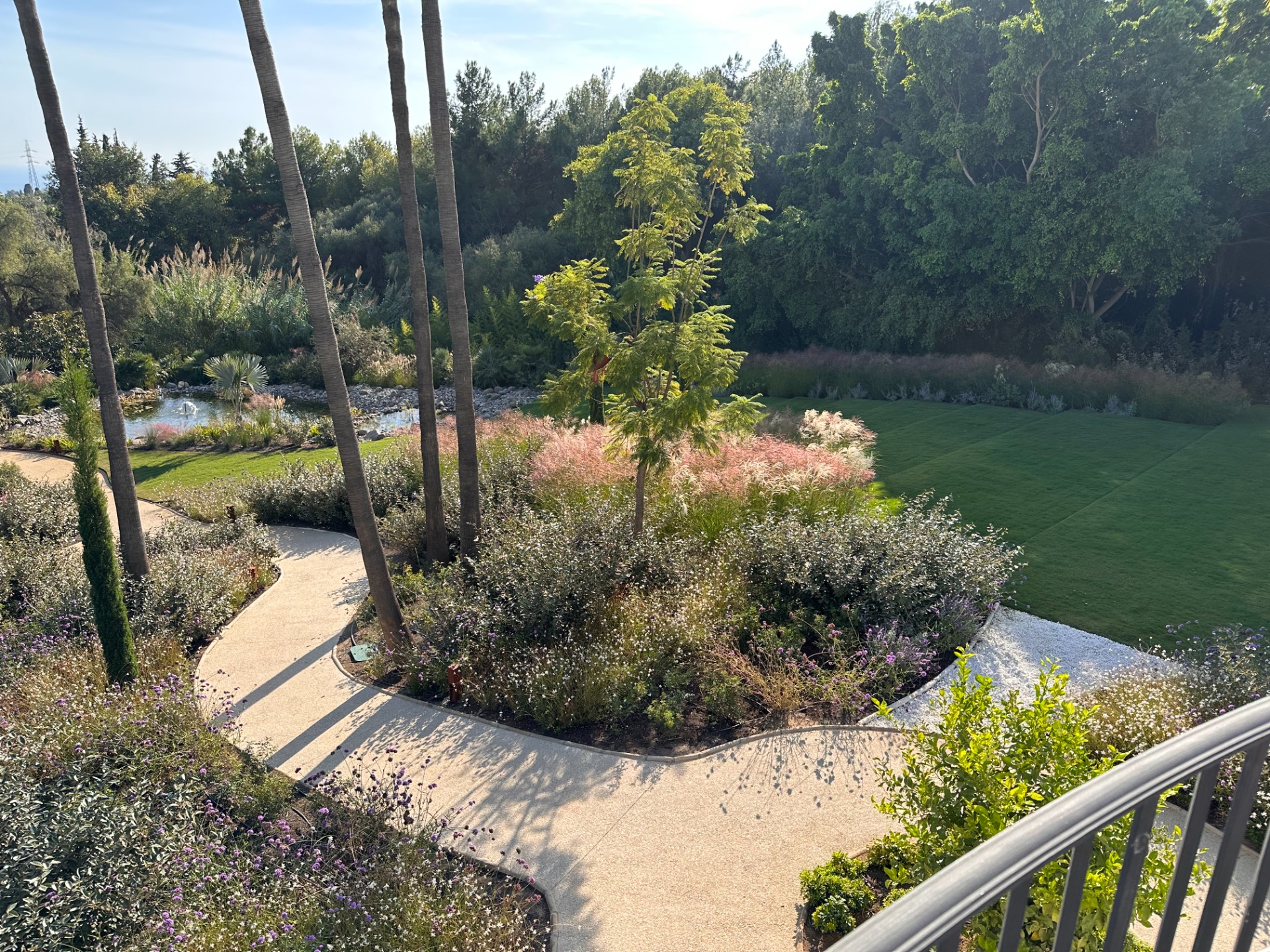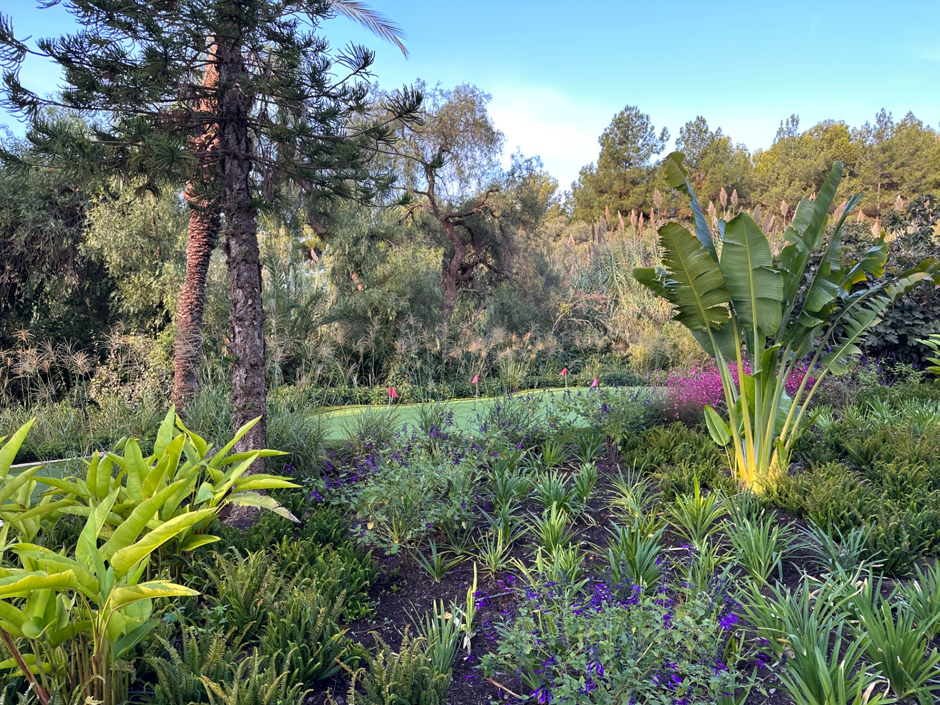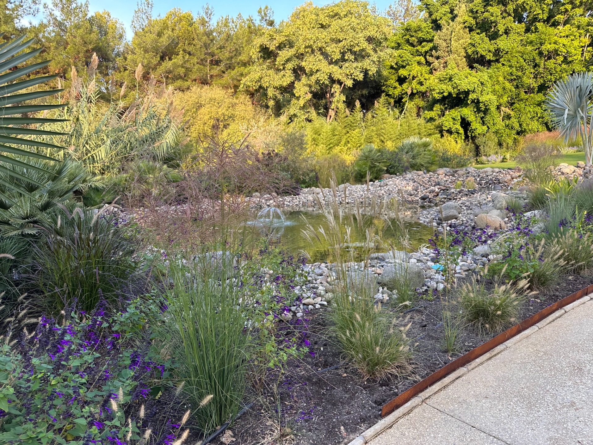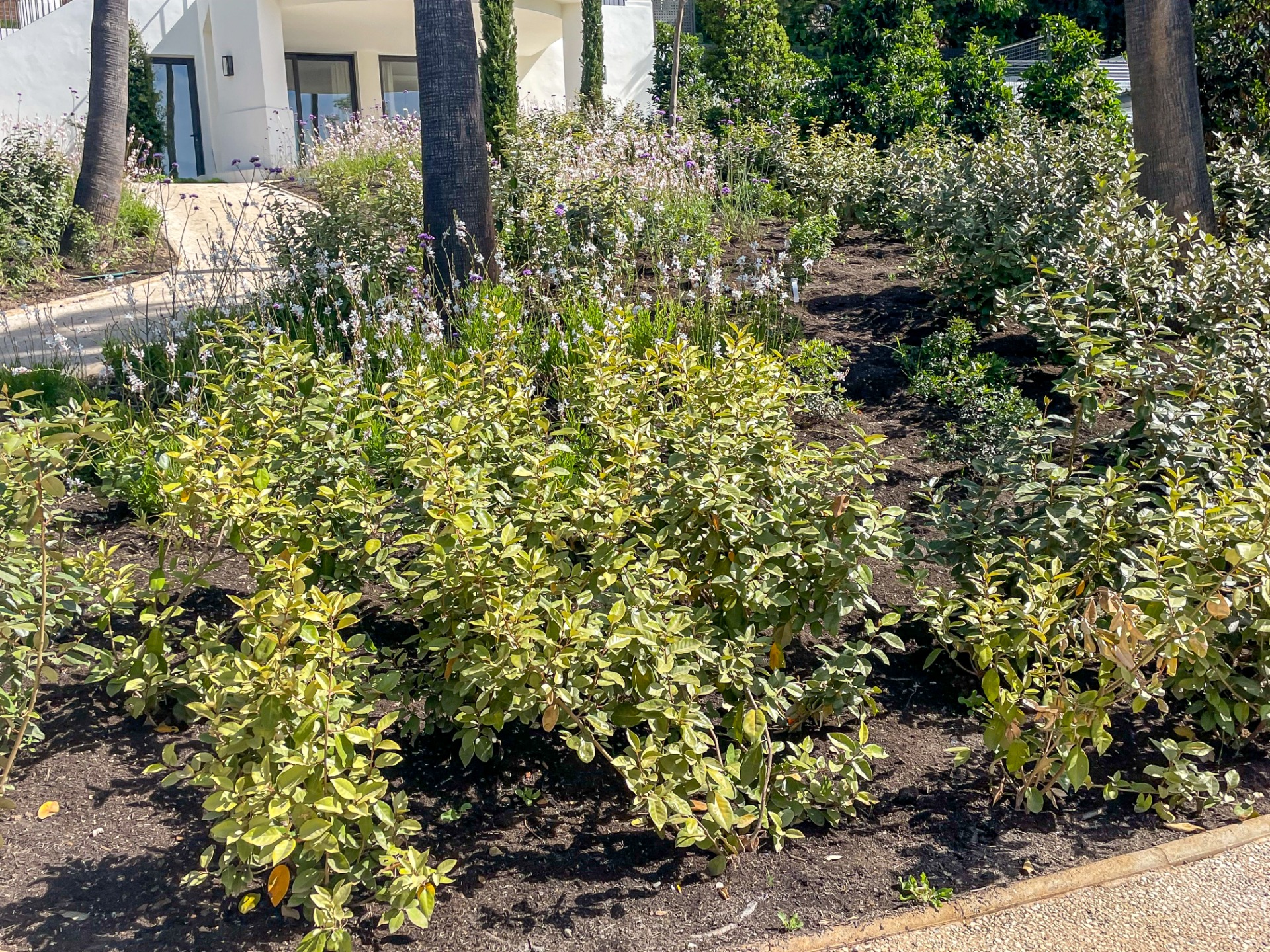 La vegetación combina olivos, cítricos, Albizia julibrissin, Jacaranda mimosifolia, Magnolia grandiflora, Washingtonia robusta, Eugenia myrtifolia, Araucaria, bambú, junto a herbáceas como Gaura y Salvia, aportando movimiento, color y riqueza visual.